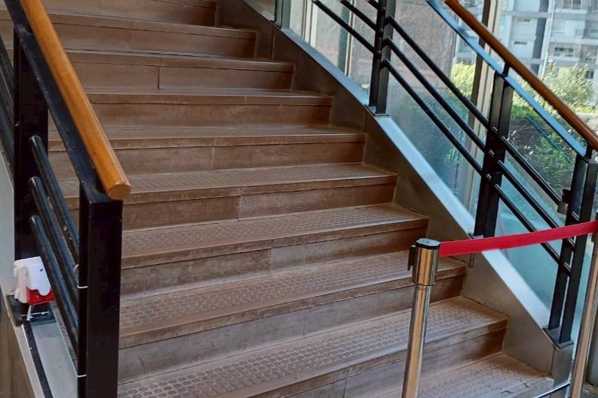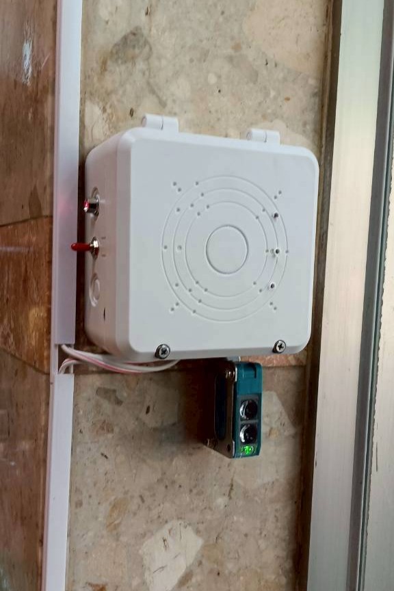 聲光警示聯動主機,主要配置於階梯轉角或人員管制區。當前端感測器捕捉到物體通過信號時,主機即刻同步觸發高分貝蜂鳴聲與紅色閃爍燈光,提供視覺與聽覺的即時警示。設備採模組化安裝於既有扶手結構,並內建手動控制開關以利後續維護測試,有效解決特定死角之動線安全與安防管制需求