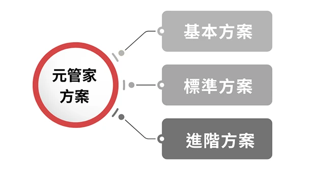 元管家方案,針對社區的樣態、戶數、出入口複雜度、社區預算…等各樣因素,推出基本方案、標準方案以及進階方案,讓社區每個月只要3,600~12,000元(需場勘) ,就可以享有夜晚安心的保障。